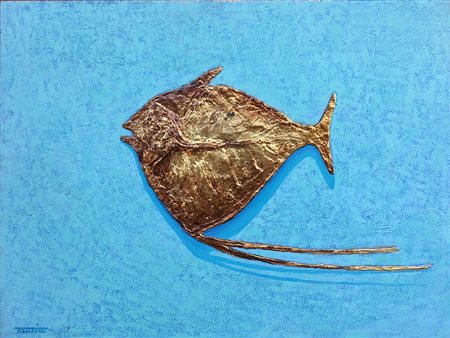 Mario Tantin (1929 - 1999) Pesce Tecnica mista e applicazione in oro su...