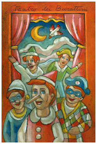 ROBERTO SGUANCI Firenze 1948 Teatro dei Burattini Olio su cartone inciso 30 x...