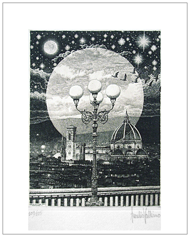 AURELIO VATTIMO Cetrato 1952 Migrazioni 2002 Acquaforte es.103/125. Firma in b. a d. + sulla lastra in b. a s.: nome, data e titolo. (50 x 35 foglio – 23 x 18 inc.) Tiratura: 125 es. num, arabi + XXV es. num. romani su carta Graphia delle Cartiere Sicars, Catania. Opera realizzata in esclusiva per la Silfi s.p.a. (Società Illuminazione, Firenze) e stampata a mano presso la Stamperia d’Arte Vittoria Pozzi, Firenze e corredata di cartellina descrittiva. base: 50