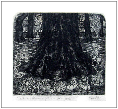 TONO ZANCANARO Padova 1906 – Padova 1985 L’albero Gibbone e gibbonaglie Acquaforte es.42/67. Firma in b. a d., titolo in b. a s. (35 x 48 ca. foglio – 22 x 25 inc.) base: 50