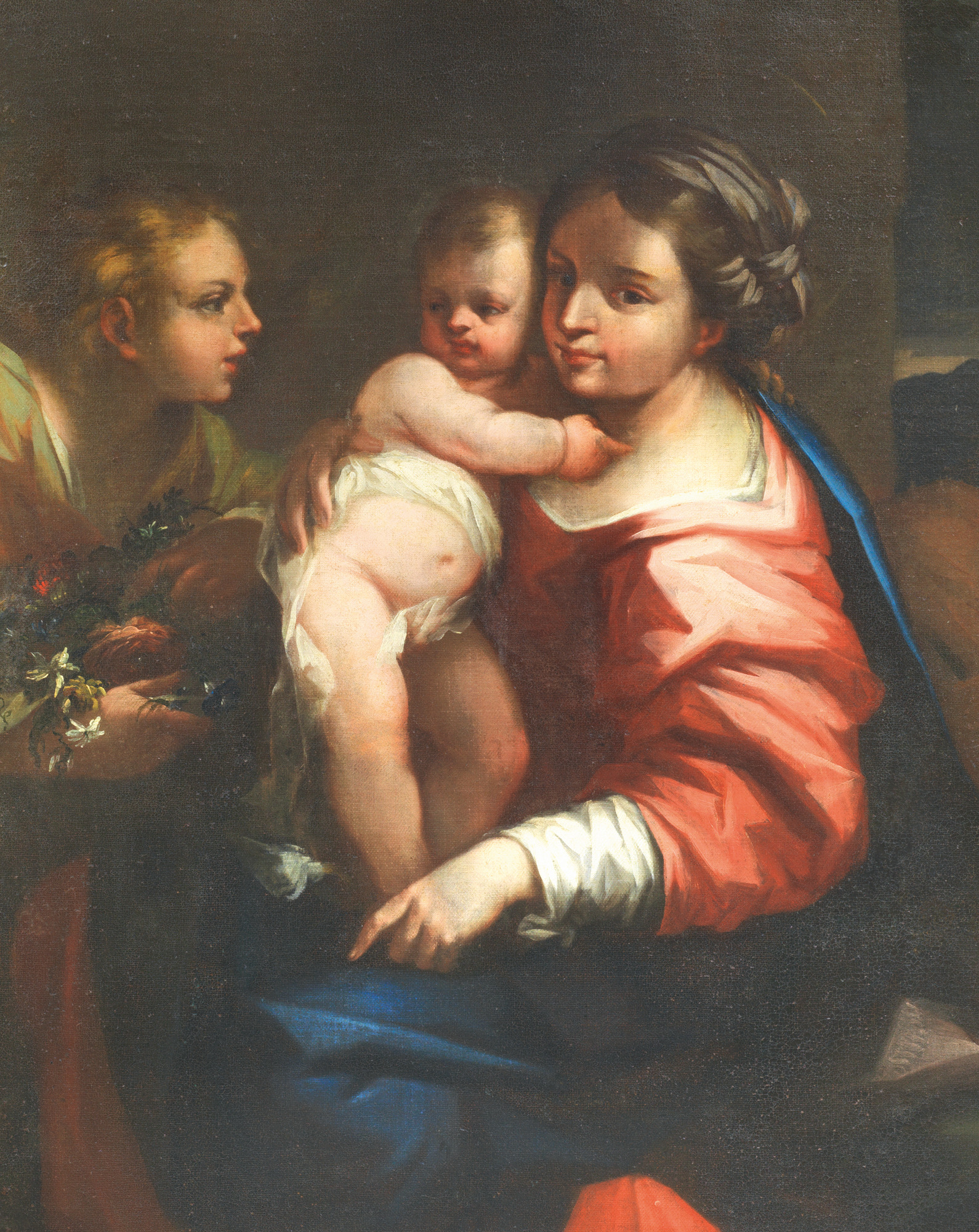 Scuola toscana prima metà del XVII secolo MADONNA CON BAMBINO E SANTA CATERINA Olio su tela, cm 121x96