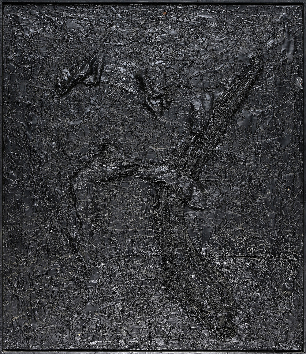FRANCO BEMPORAD 1926 - 1989 Il potere individuale , 1956 Olio, catrame e stracci su tavola, cm. 122 x 104 Firmato e datato sul retro Prov. Collezione Privata