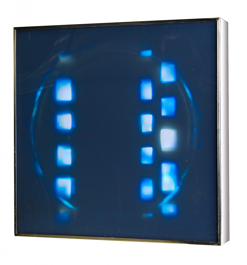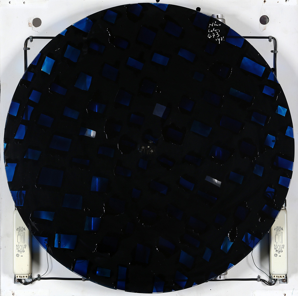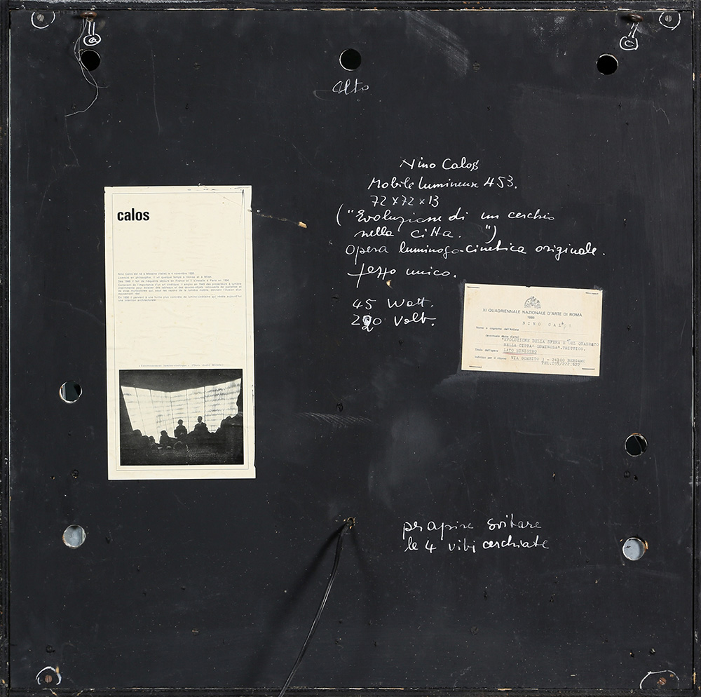 NINO CALOS 1926 - 1990 Mobile Luminose 453 “Evoluzione di un cerchio nella città”, 1975 Box, legno, acciaio, plexiglass e sistema elettrico luminoso, cm. 72 x 72 x 13 Firmato sul retro Firmato e datato sul disco interno Etichetta XI Quadriennale d’Arte di Roma, sul retro Opera in fase di Archiviazione presso l’Archivio Nino Calos, Parigi L’ autenticità dell’opera è stata confermata dal Comitato Nino Calos via e-mail Prov. Collezione Privata ESPOSIZIONI: “XI Quadriennale di Roma”, EUR - Palazzo dei Congressi, Roma, 16 giugno - 16 agosto 1986