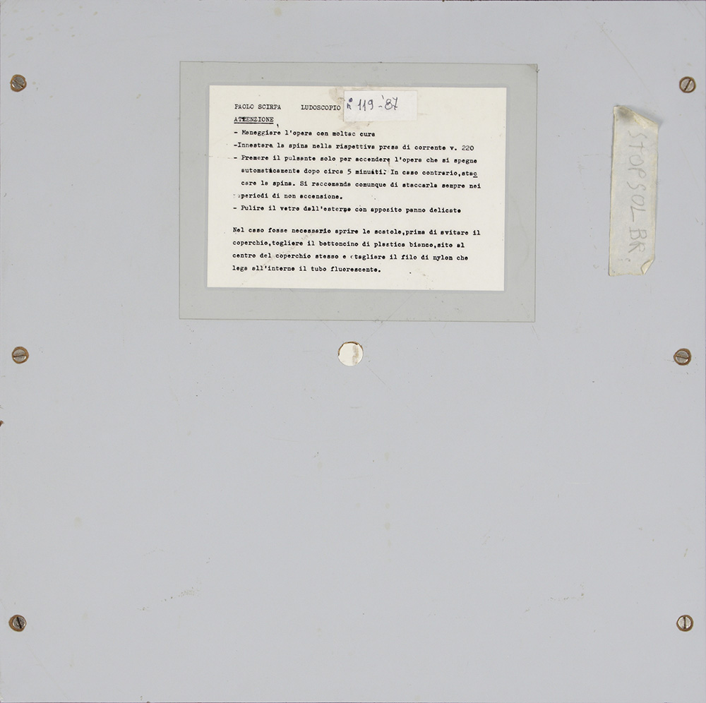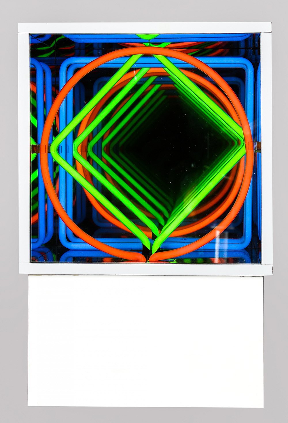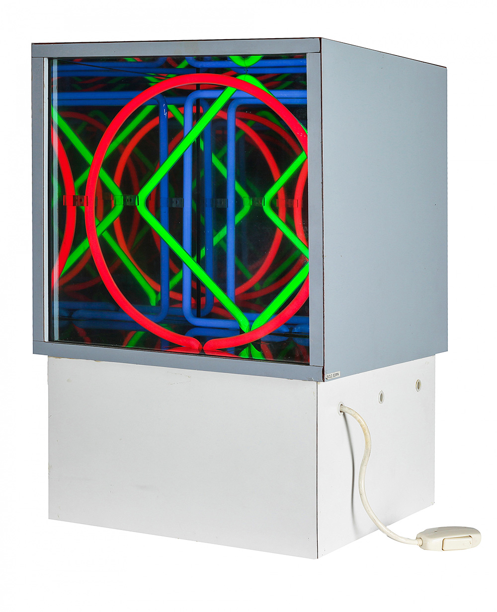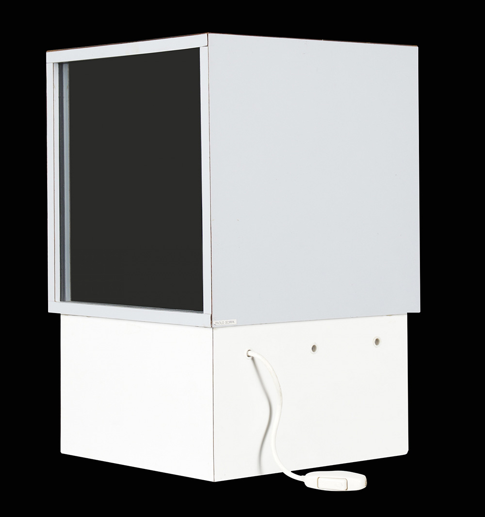PAOLO SCIRPA 1934 Ludoscopio N.119, 1987 Assemblaggio, legno, neon e specchio, cm. 30,5 x 30,5 x 35,5 + base cm. 16,5 Firmato e datato alla base Prov. Collezione Privata