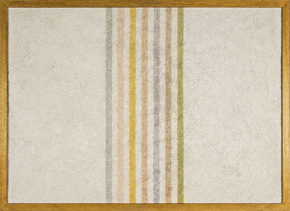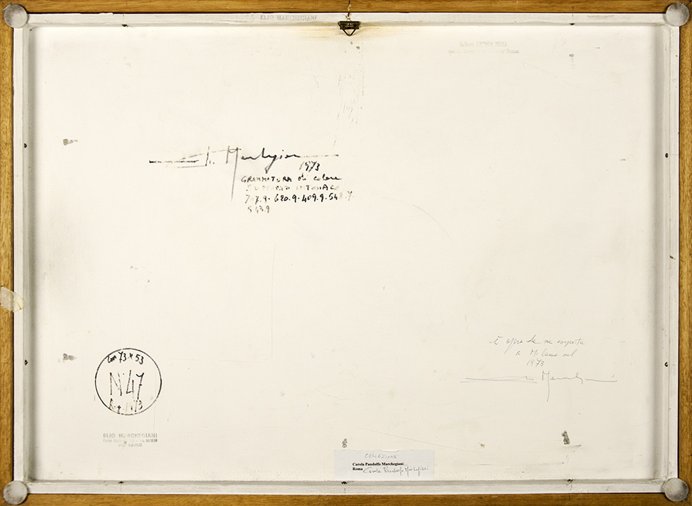 ELIO MARCHEGIANI 1929 Grammatura di colore, 1973 Grammatura di colore su intonaco, cm. 53 x 73 Firmato e datato sul retro Timbro dell’artista sul retro Etichetta Carola Pandolfo Marchegiani, Roma sul retro Autentica dell’artista sul retro Autentica dell’artista su fotografia Prov. Collezione Carola Pandolfo Marchegiani, Roma Prov. Collezione Privata