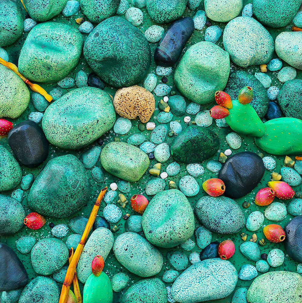 PIERO GILARDI 1942 Spiaggia con fichi d’india, 2006 Scultura in poliuretano espanso in teca di plexi- glass, cm. 100 x 100 x 25 Firmato e datato sul retro Autentica dell’artista su fotografia Prov. Collezione Privata