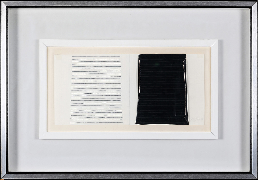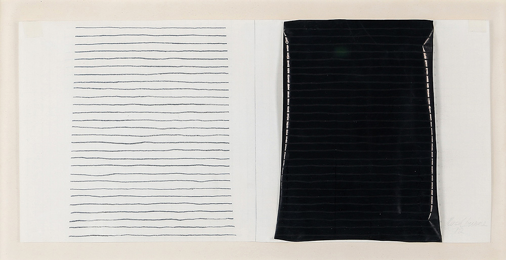 DOROTHEA ROCKBURNE 1934 Senza titolo, 1972 Impressione su carta quadrettata e collage di carta copiativa cm. 14 x 31 Firmato e datato in basso a destra Timbro Galleria Banco, Brescia sul retro Prov. Collezione Privata