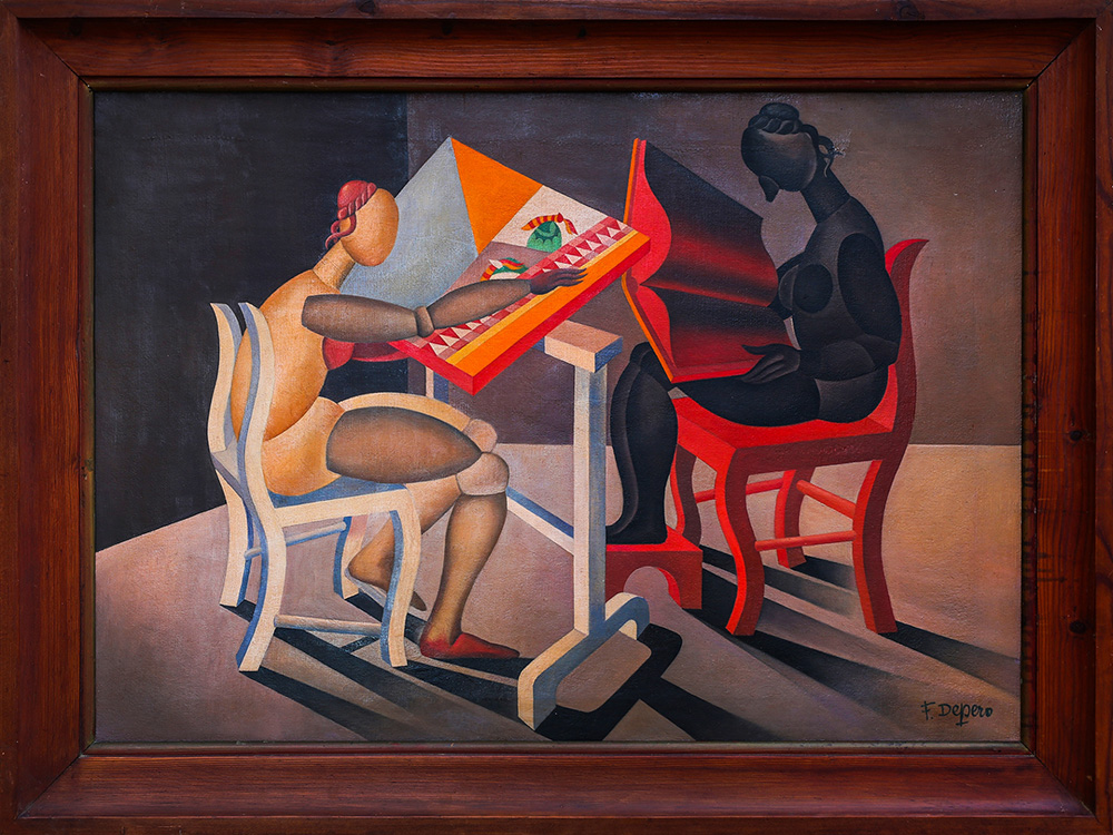 FORTUNATO DEPERO 1892 - 1960 Lettrice e ricamatrice automatiche, 1921-23 Olio su tela, cm. 67,7 x 96,5 Firmato in basso a destra Opera Archiviata presso l’Archivio Depero a cura di Maurizio Scudiero, Rovereto Prov. Galleria Cortina, Milano Prov. Collezione Privata PUBBLICAZIONI: “Fortunato Depero: ein Künstler des Futurismus”, catalogo mostra Bonn Saarbrücken, Hannover 1973, Editore Manfrini, Calliano, tav. 46