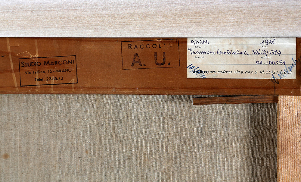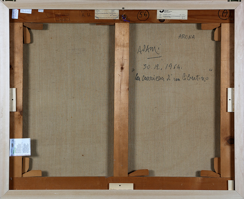 VALERIO ADAMI 1935 La carriera di un libertino, 1964 Acrilico su tela, cm. 81 x 100 Firmato e datato sul retro Timbro Studio Marconi, Milano sul retro Etichetta Studio C arte moderna, Brescia sul retro Etichetta La nuova città, Brescia sul retro Certificato di Provenienza Galleria Sant’Agostino Autentica su fotografia a cura dell’Archivio Valerio Adami, Roma Prov. Collezione Privata