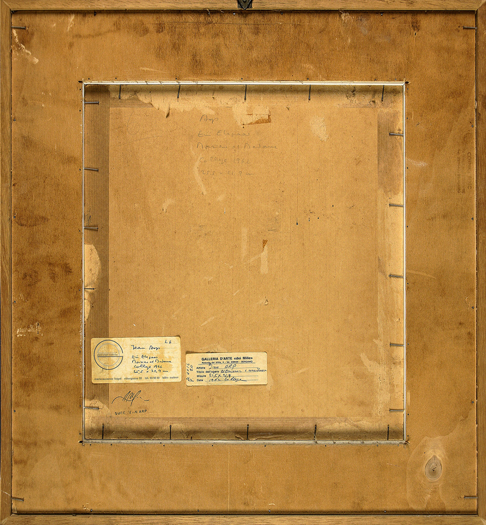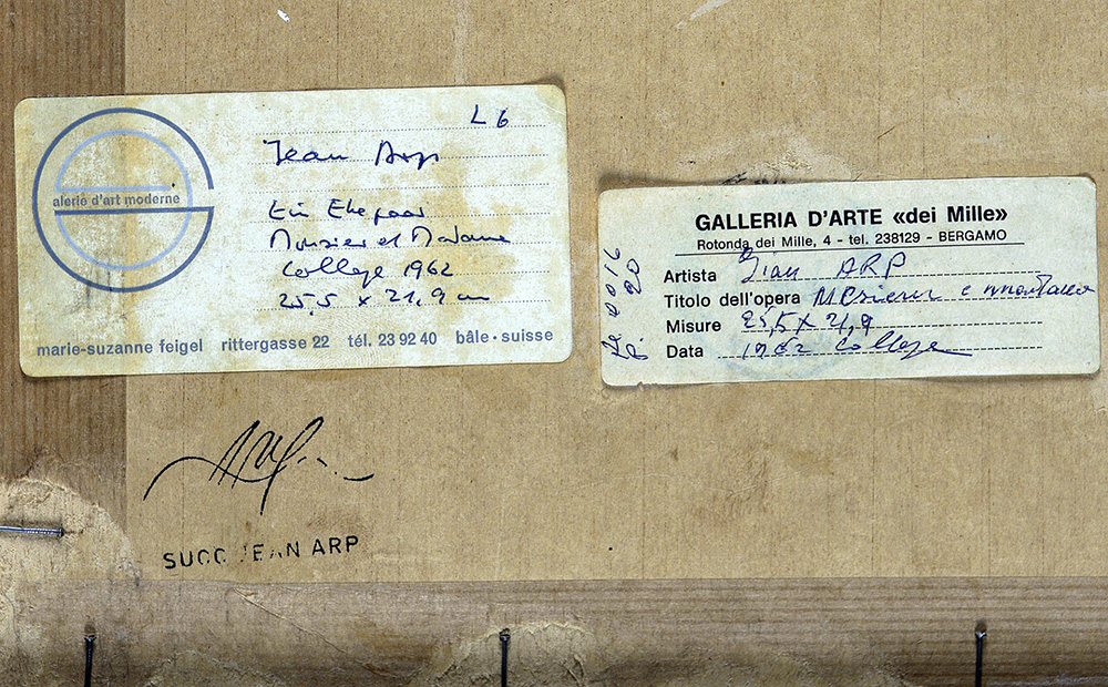 HANS ARP 1886 - 1966 Monsieur et madame, 1962 Tecnica mista e collage su carta, cm. 38,5 x 34,5 (interno cm. 25,5 x 21,5) Firmato in basso a sinistra Etichetta Galleria d’Arte dei Mille, Bergamo sul retro Etichetta Galerie d’Art Moderne, Basilea sul retro Timbro dell’artista sul retro Prov. Collezione Privata