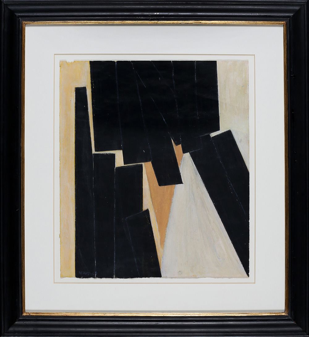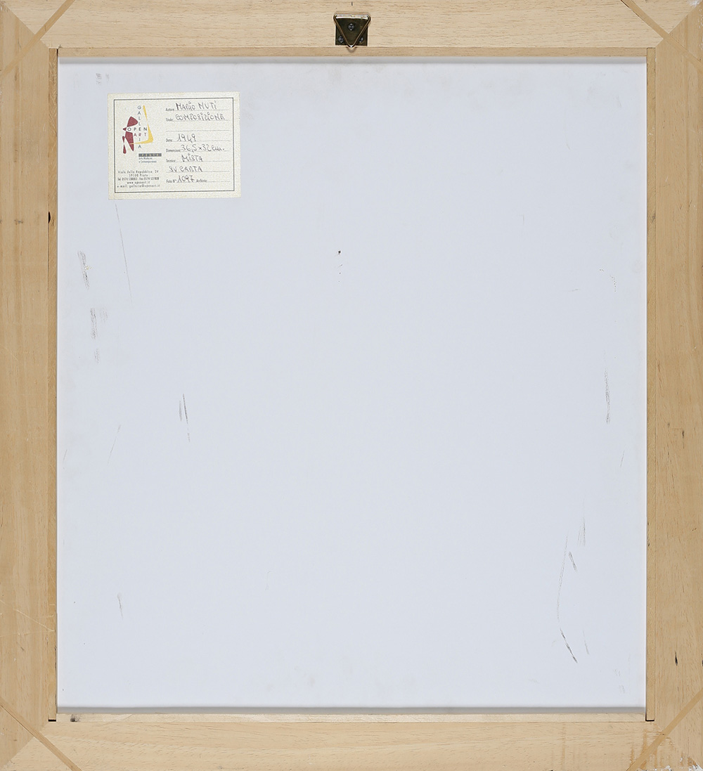 MARIO NUTI 1923 - 1996 Composizione, 1949 Tecnica mista su carta, cm. 36,5 x 32 Firmato e datato in basso a sinistra Timbro Galleria Open Art, Prato sul retro Autentica su fotografia a cura della Galleria Open Art Prov. Collezione Privata PUBBLICAZIONI: “Mario Nuti - Fra astrazione e classicismo”, catalogo mostra Galleria open Art Prato (11 novembre 2006 - 13 gennaio 2007), Masso delle Fate Edizioni e Galleria Open Art, 2006, p. 51