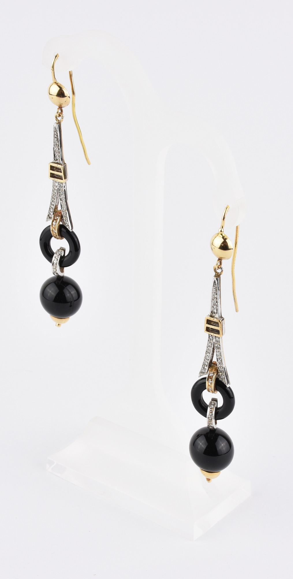 PAIO DI ORECCHINI PENDENTI IN ORO A BASSO TITOLO, ONICE E DIAMANTI realizzati con ago ed elemento in oro bianco e giallo 14k decorato in piccoli brillanti, onice sagomata e sfera in onice pendente, un diamante mancante, punzone 14K, lungh. cm 8 Stato di conservazione complessivo molto buono. PAIR OF PENDANT EARRINGS IN 14K YELLOW AND WHITE GOLD, ONYX AND DIAMONDS Overall very good condition.