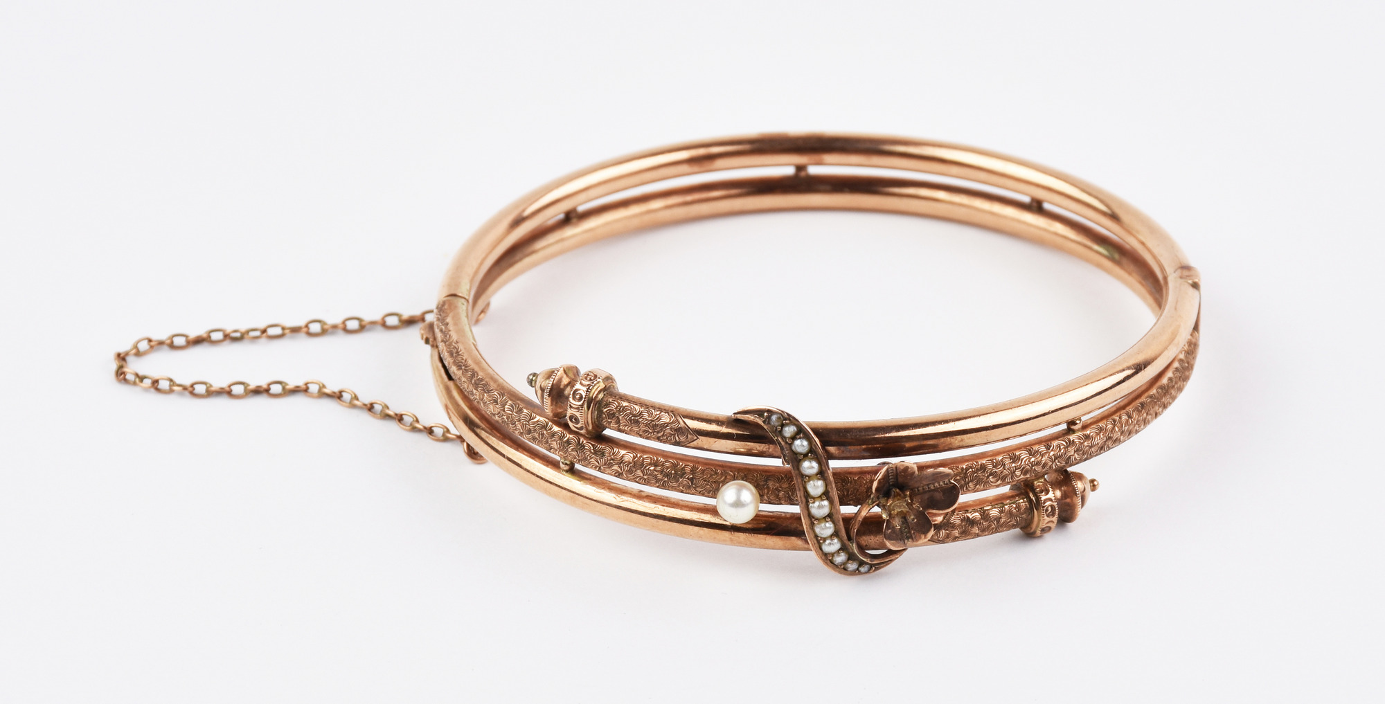 BRACCIALE RIGIDO E SPILLA IN ORO A BASSO TITOLO MICROPERLE E PASTE il...