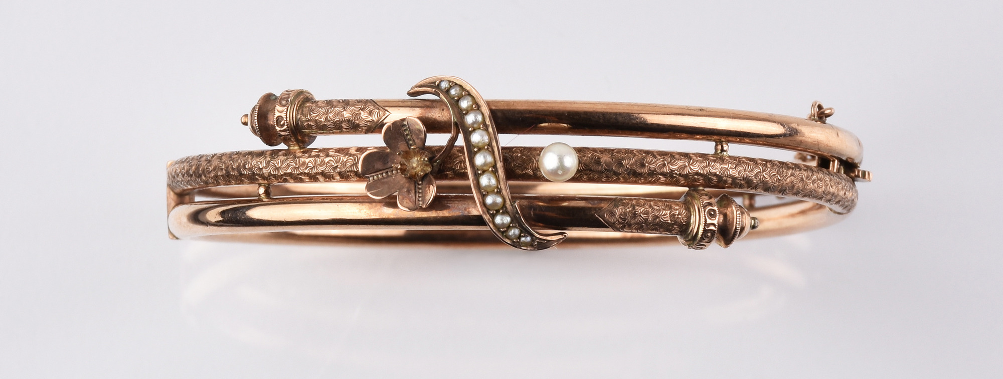 BRACCIALE RIGIDO E SPILLA IN ORO A BASSO TITOLO MICROPERLE E PASTE il bracciale a doppia canna vuota in oro rosa 8 kt cesellato decorato al centro da trifoglio e motivo a volute in microperle, punzone 333, diam. cm 6; spilla a barretta in oro rosa 8 kt, con pendente borbonico in oro giallo 18 kt decorati in microperle, pasta vitrea rossa e pasta di turchese, dim. cm 4,5x4,5 Stato di conservazione complessivo molto buono. La parte superiore della spilla presenta una saldatura aperta, spilla e pendente sono coevi ma assemblati. A 9KT CANE ROSE GOLD BANGLE BRACELET AND A BROOCH IN 9 AND 18 KT GOLD, MICROPEARLS, GLASS AND TURQUOISE PASTE Overall very good condition. The upper part of the brooch presents a broken solder, brooch and pendant are from the same period but were assembled.