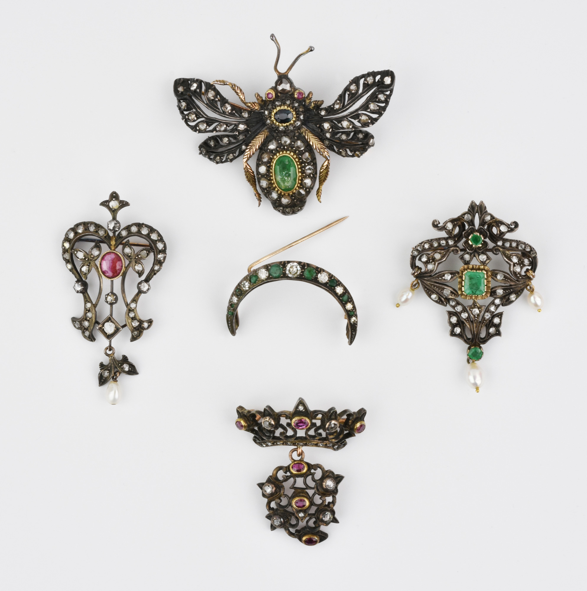 CINQUE SPILLE IN ARGENTO, ORO A BASSO TITOLO, PIETRE DI COLORE, DIAMANTI E PERLE realizzate argento e oro giallo e rosa traforato, decorate in pietre e perle e modellate rispettivamente una a moscone, una a corona, una a mezzaluna e due a volute Stato di conservazione complessivo ottimo. Uno smeraldo mancante. FIVE SILVER, LOW TITLE GOLD AND GEMSET BROOCHES Overall excellent conditions. One missing emerald.