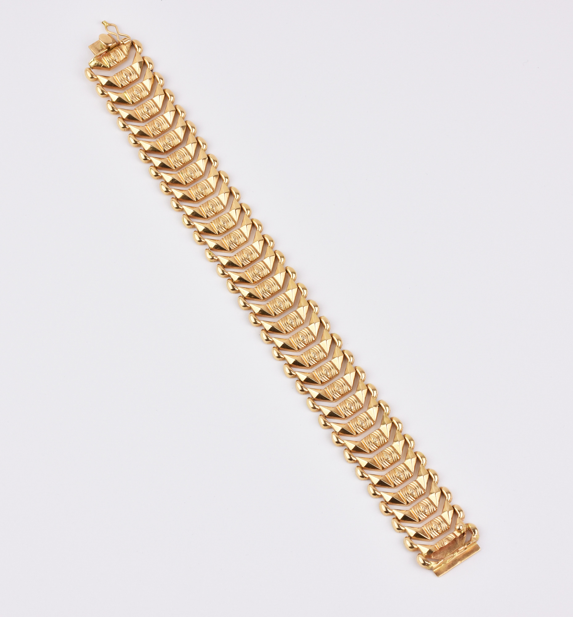 BRACCIALE STILE CARRARMATO IN ORO ROSA ad una linea di maglie sagomate ed incise imperniate tra loro, punzone 750, dim. cm 19,4x2 Stato di conservazione complessivo ottimo. TANK LINK BRACELET IN ROSE GOLD Overall excellent condition.