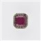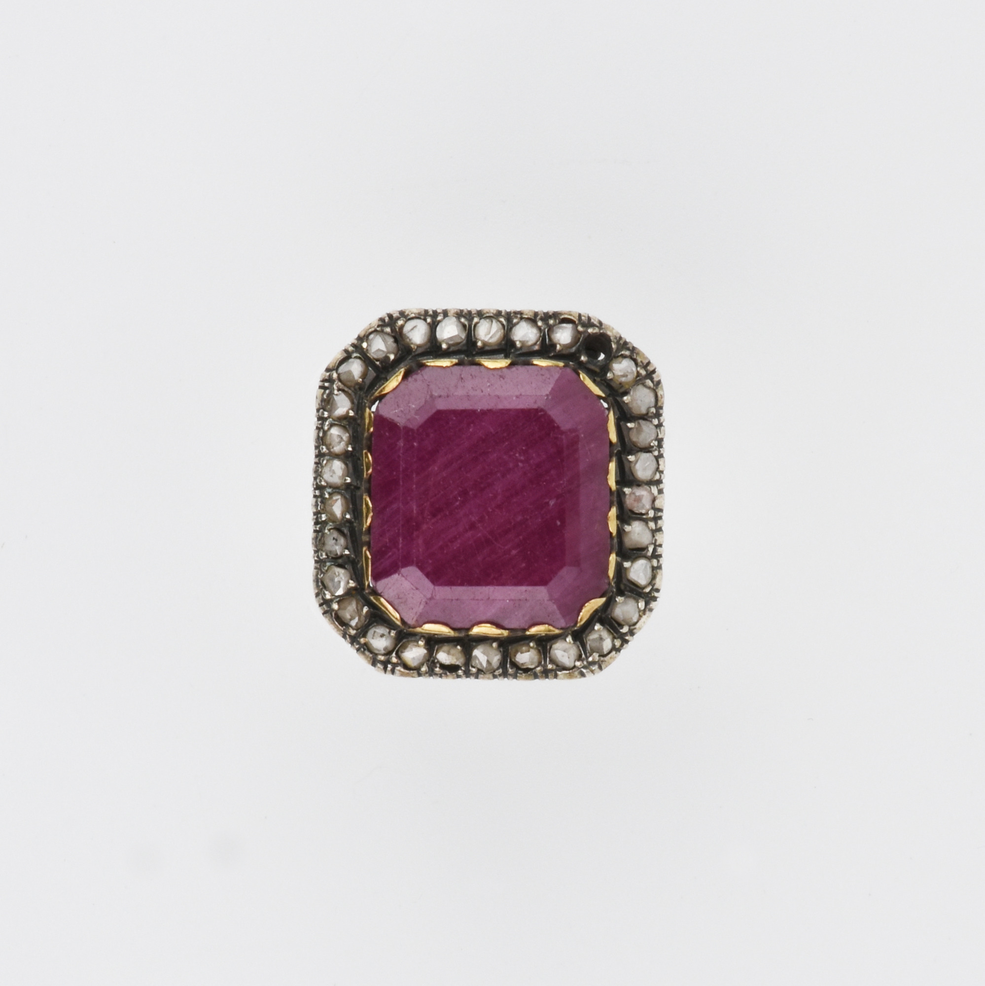 ANELLO IN ORO GIALLO, ARGENTO, RUBINO E DIAMANTI montatura in oro traforato e cesellato a volute, al centro un rubino taglio ottagonale sfaccettato di mm 17,7x16,2x3,3 circa entro cornice in argento e rose di diamanti Stato di conservazione complessivo molto buono. Un diamante mancante. RUBY, DIAMOND, YELLOW GOLD AND SILVER RING Overall very good conditions. One missing diamond.