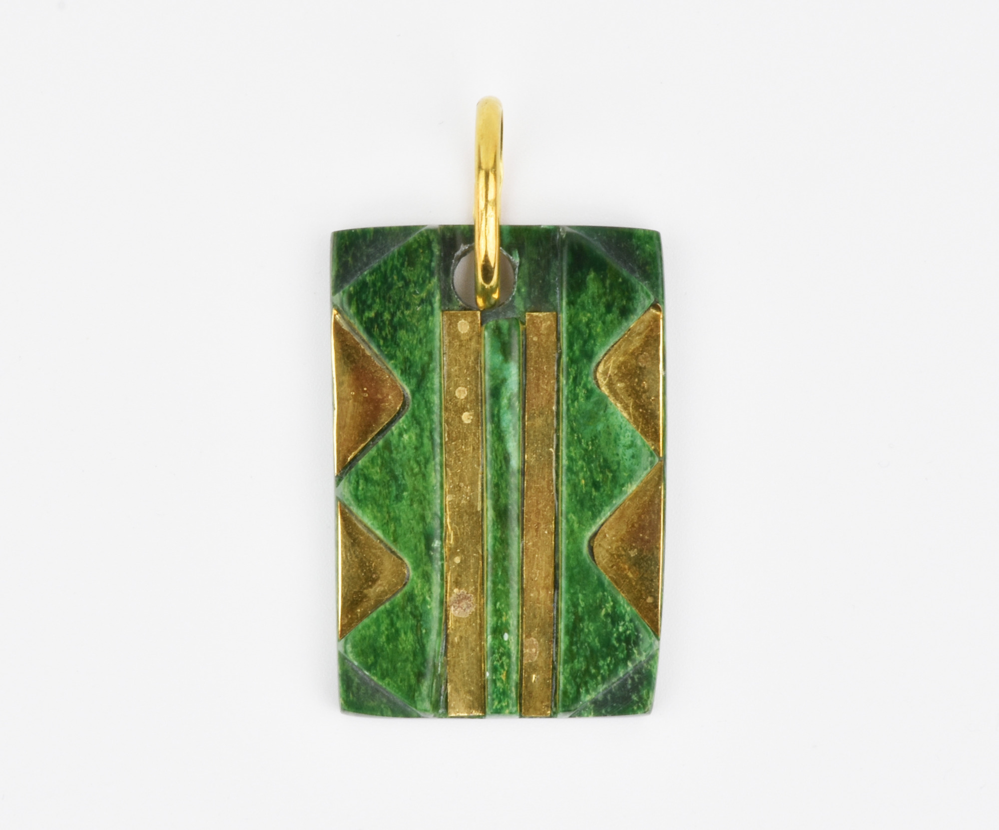PENDENTE IN ORO GIALLO E SERPENTINO disegnato come una piastrina rettangolare in serpentino intagliato a motivi geometrici, la parte frontale decorata da inserti in oro, punzone 750, dim. cm 5x2,7 Stato di conservazione complessivo ottimo. SERPENTINE AND YELLOW GOLD PENDANT Overall excellent conditions.