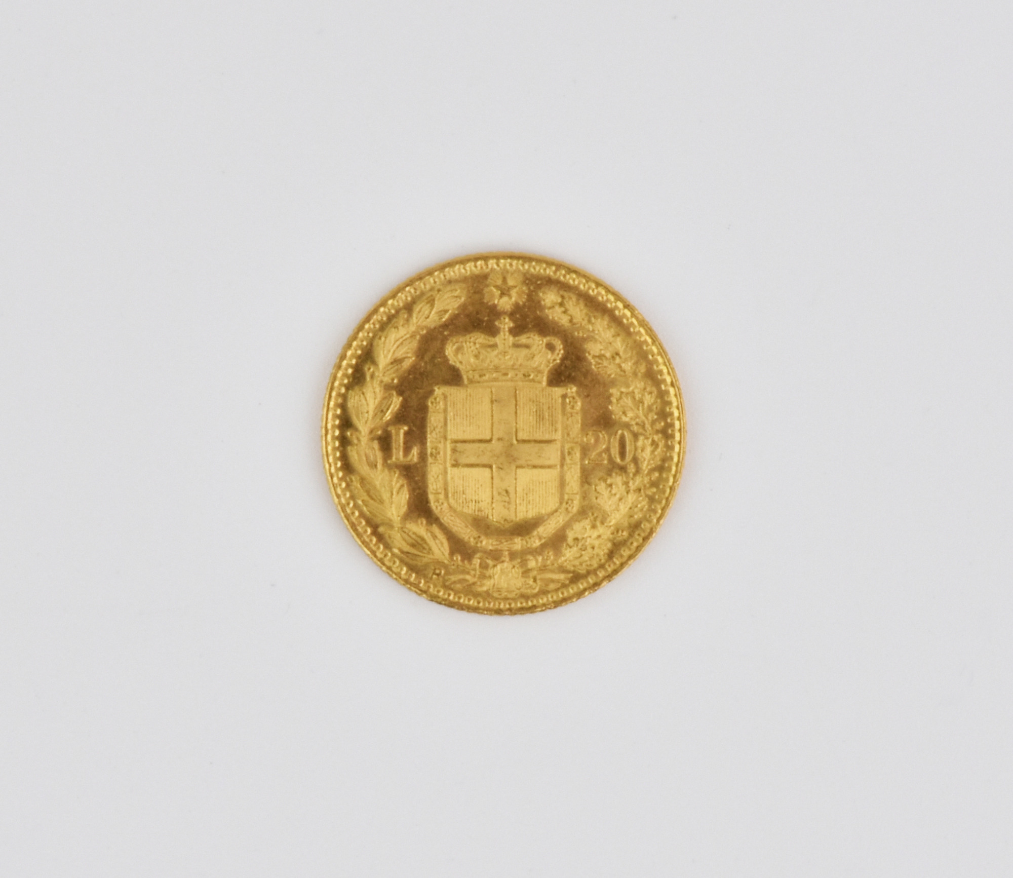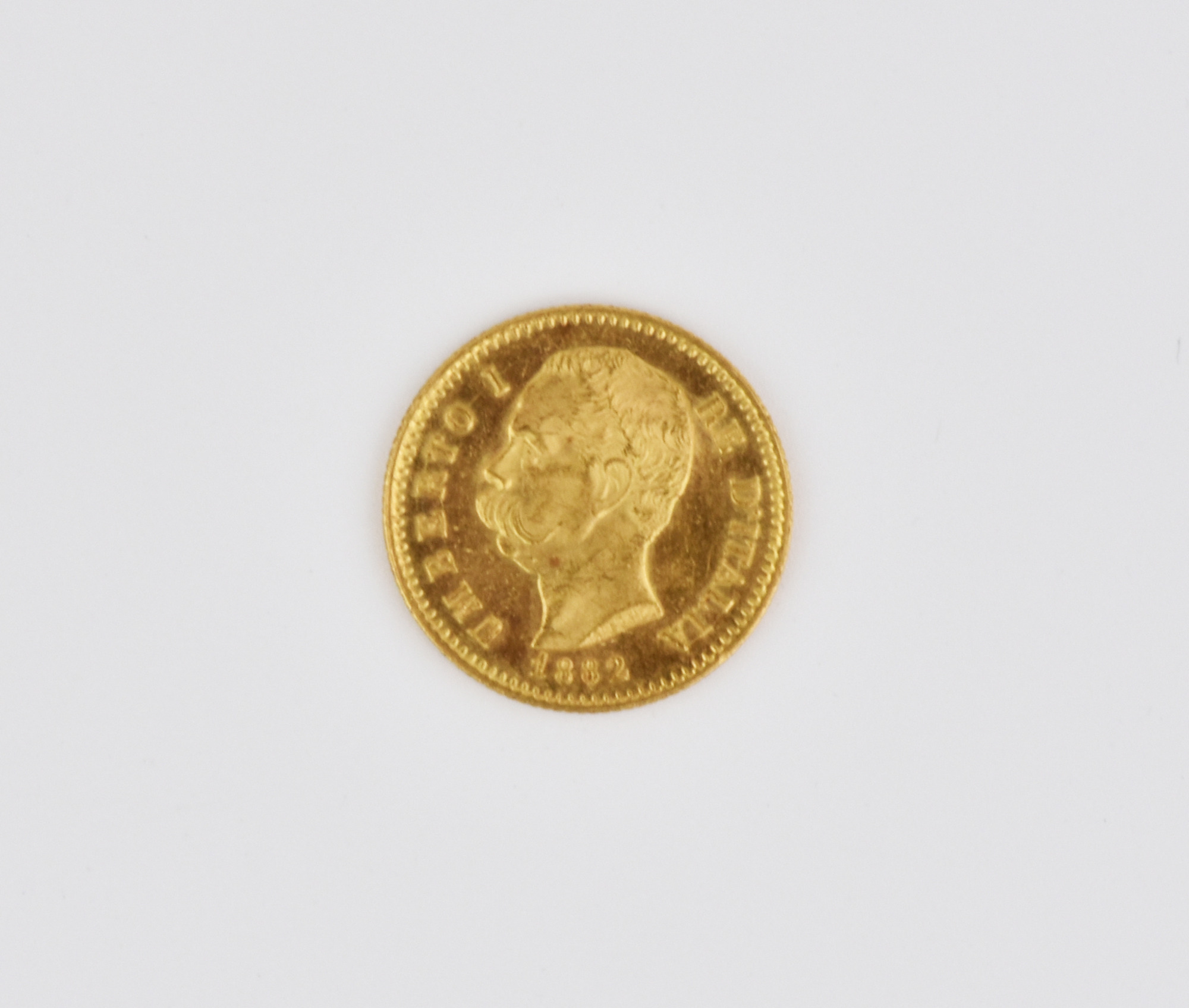 MARENGO IN ORO GIALLO marengo da 20 lire raffigurante Umberto I Re d’Italia datato 1882 YELLOW GOLD 1882 MARENGO COIN