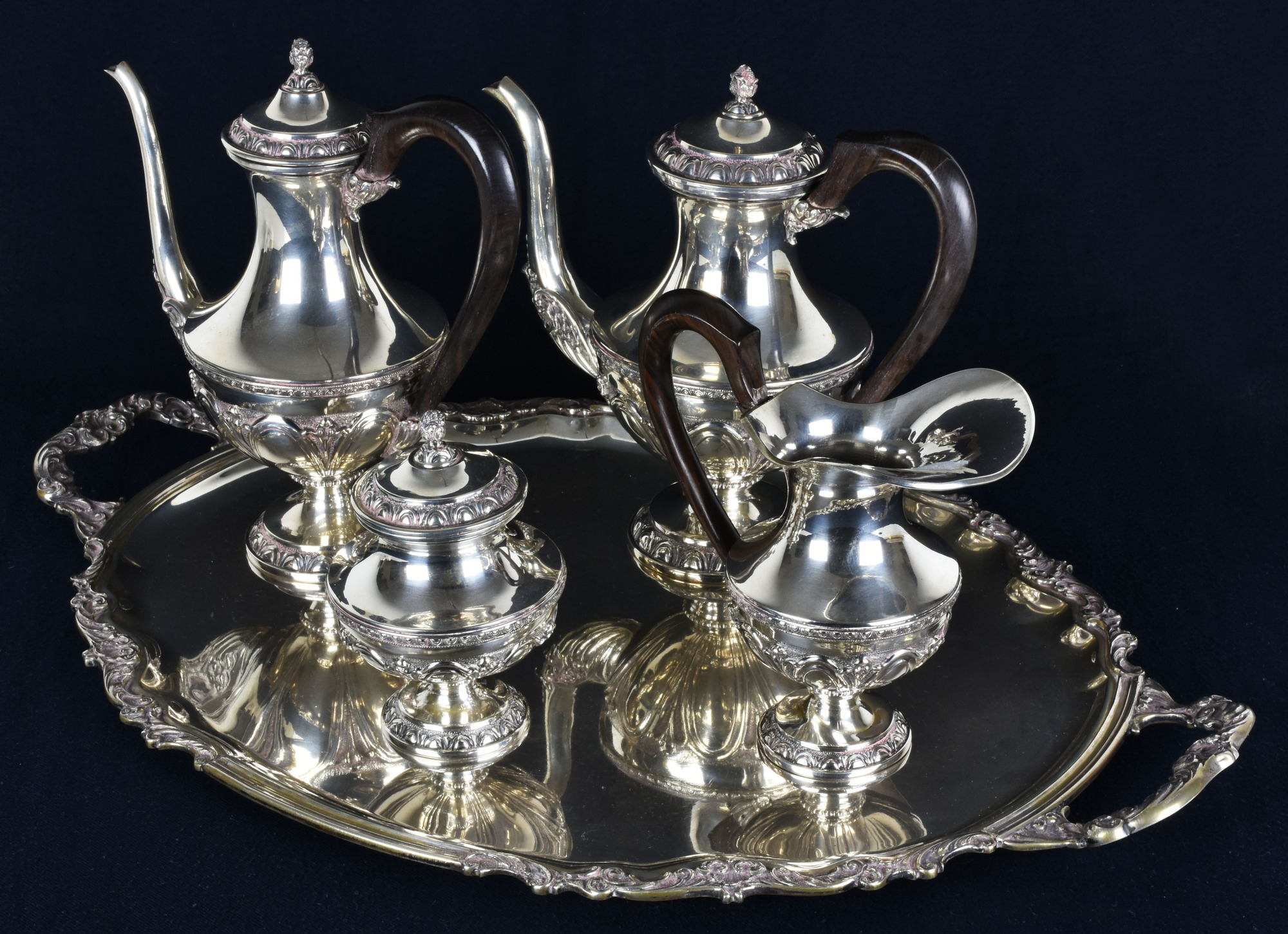 SERVIZIO DA THE E CAFFE' IN ARGENTO 800 CON VASSOIO peso complessivo gr 3390 A THE AND COFFEE SILVER SERVICE 7,47 lb.