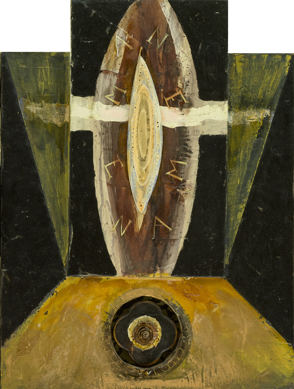 Bruno Ceccobelli (Montecastello Vibio (Pg) 1952 ) Attraversare le porte 1988, Tecnica mista su legno, cm. 82x63, Sul verso: firma e titolo; Etichetta Anfiteatro Arte, Padova, con descrizione. Esposizione: "San Lorenzo e Dintorni, Maggio 2007, Anfiteatro Arte, Padova, pubblicato sul catalogo della mostra a pag. 33. Autentica dell'Artista su foto.