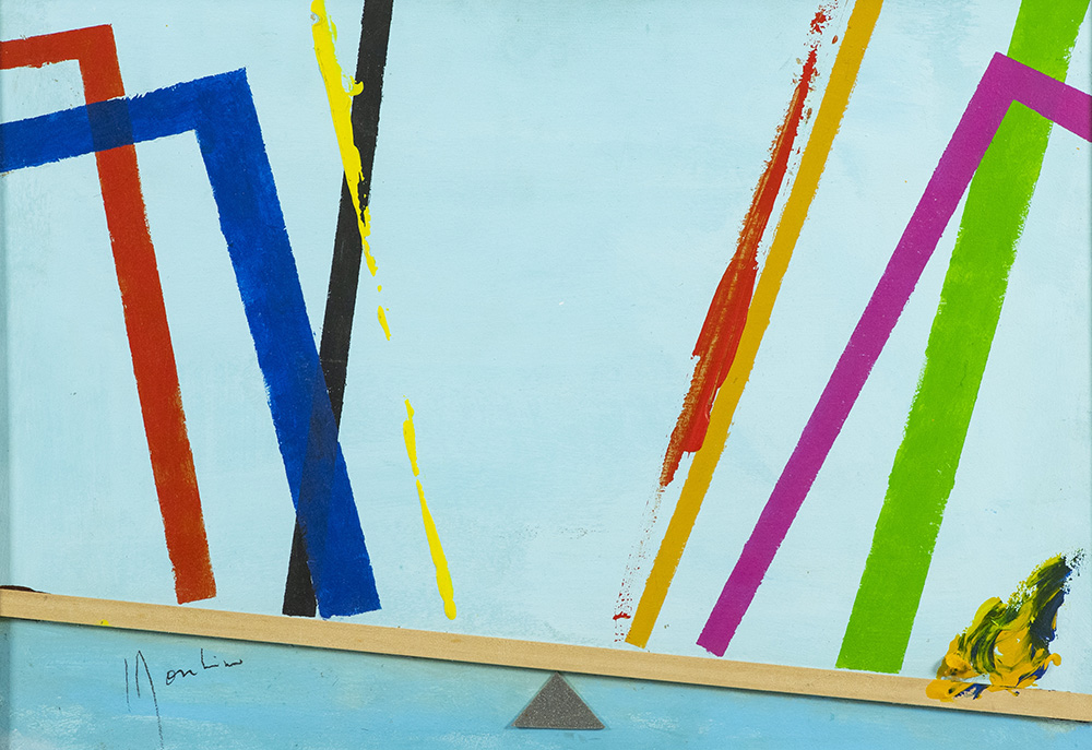 Aldo Mondino (Torino 1938 Torino 2005) Bilance su fondo blu 1973, Tecnica mista e applicazione su tavola, cm. 35x50., Firmato in basso a sinistra. Bibliografia: "Aldo Mondino - Catalogo generale" vol. 1 Autentica dell'Archivio Aldo Mondino con timbro a secco e firma "Antonio Mondino" e Archivio n° 20080619002655. Certificato di provenienza "Galleria d'Arte Il Melograno", Livorno.