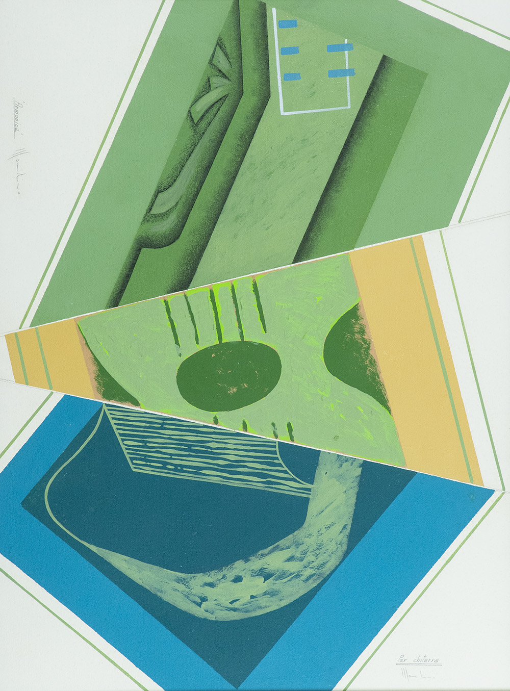 Aldo Mondino (Torino 1938 Torino 2005) Armonica per chitarra , Olio e tecnica mista su cartoncino cm. 74x55., Firma e titolo in basso a destra e in alto a sinistra.