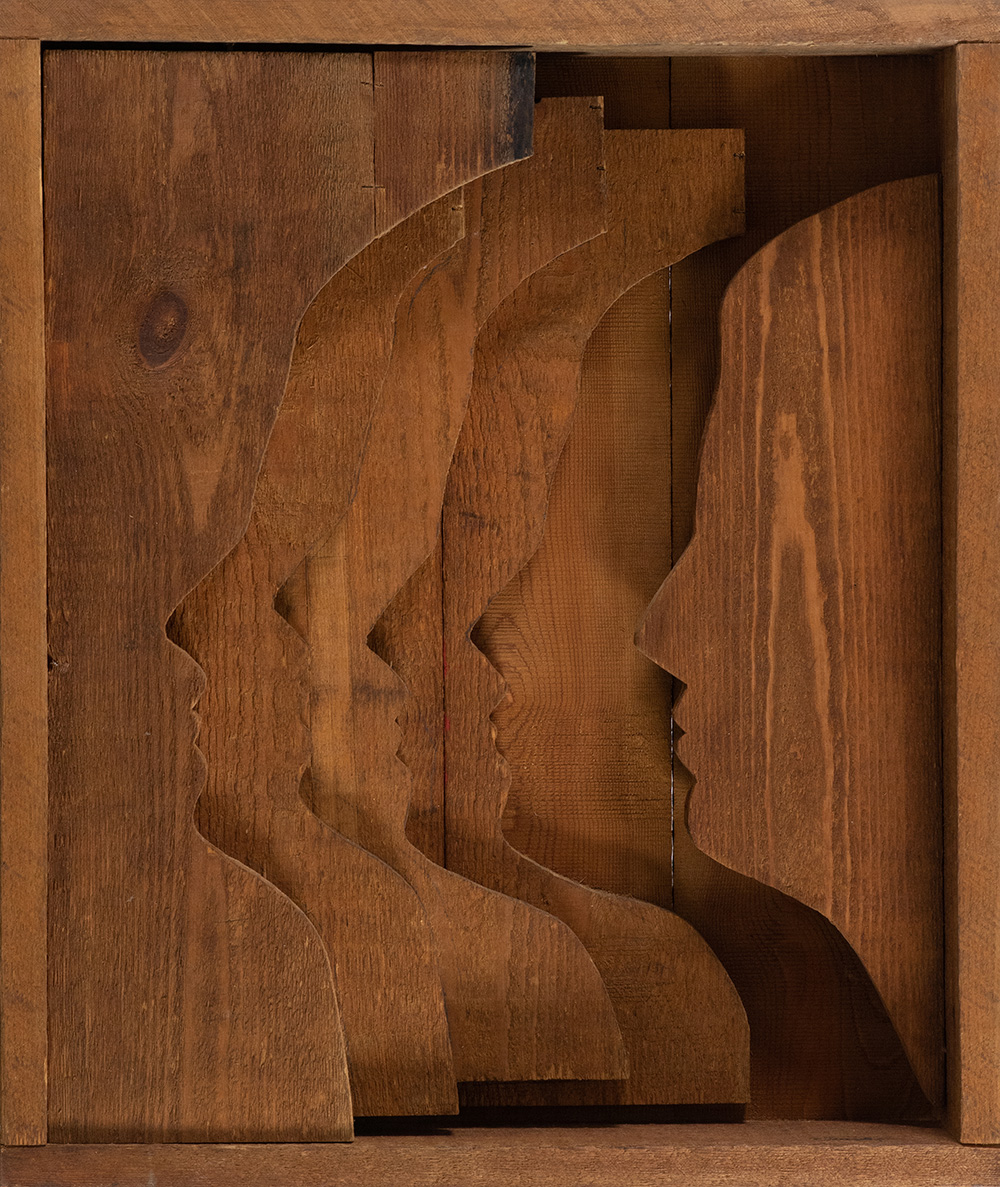 Mario Ceroli (Castelfrentano (Ch) 1938 ) Profili , Scultura in legni di pino di Russia, cm. 65x55x13., Firmato in basso a destra. Autentica dell'Artista su foto.