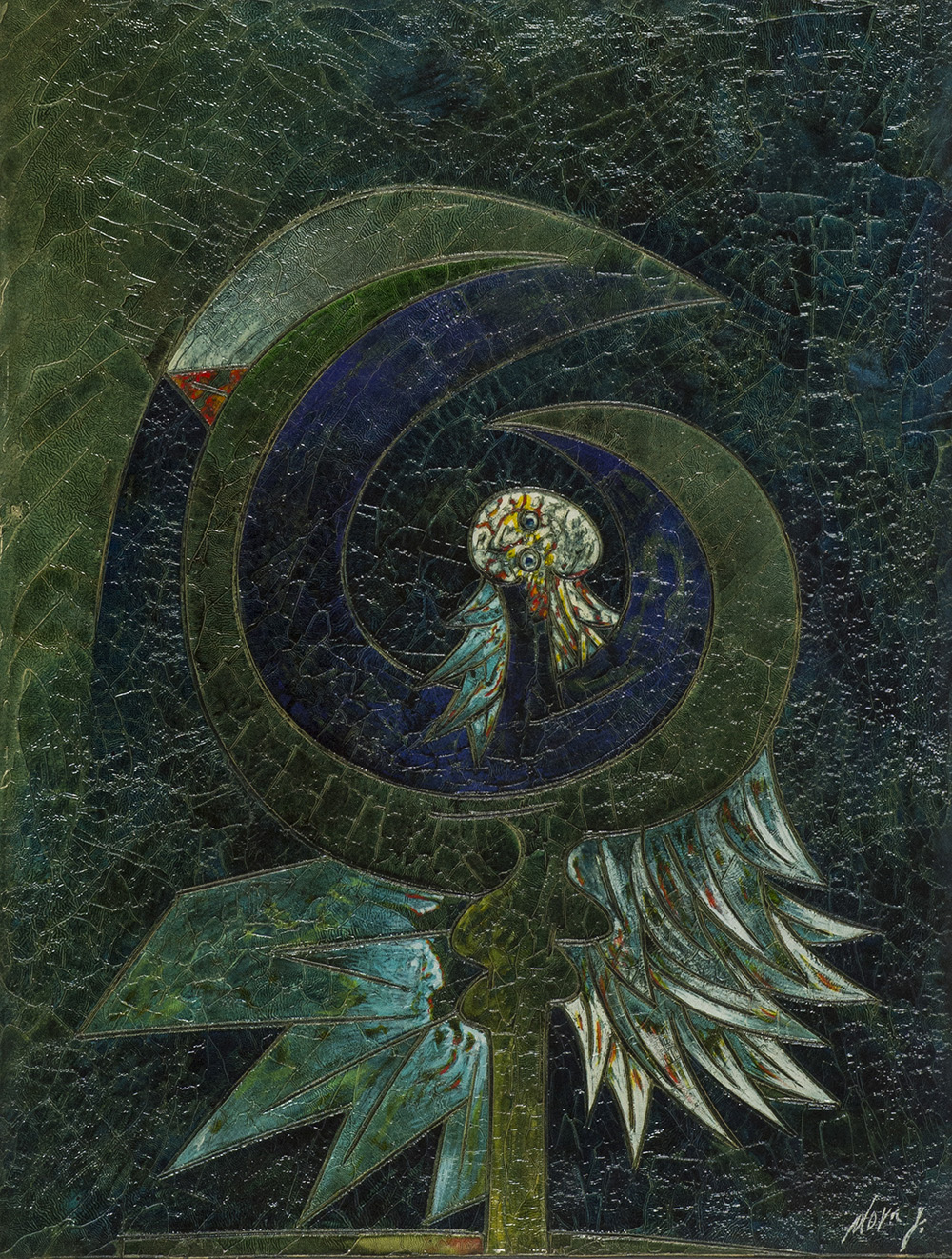 Gianni Dova (Roma 1925 Pisa 1991) Le ali e le piume al bersaglio 1967, Olio su tela, cm. 55x42, Firmato in basso a destra; Sul vero: firma e titolo; Timbro: "Galleria d'Arte Borgonga", Milano con descrizione. Esposizione: "Gianni Dova 1967-1968, Galleria Arte, Borgogna, Edizioni Arte Borgogna, Severgnini Stampa, Milano, 1968, pubblicato sul catalogo della mostra. Autentica del Comitato Promotore Archivio e Catalogo Ragionato delle opere di Gianni Dova, su foto. L'opera è stata inserita nell'Archivio delle opere di Gianni Dova con il n° 26/2013.