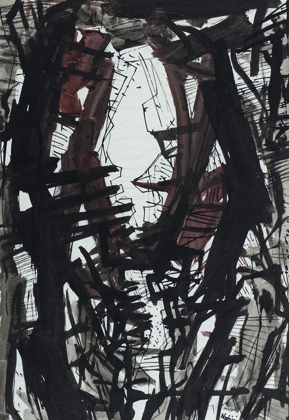 Gualtiero Nativi (Pistoia 1921 Greve in Chianti (Fi) 1999) Senza titolo 1961, Tecnica mista su carta, cm. 50,5x35,5., Firma e data in basso a destra. Autentica dell'Archivio Gualtiero Nativi su foto con timbro a secco, firma "Berto Nativi" e Archivio n° D6125.