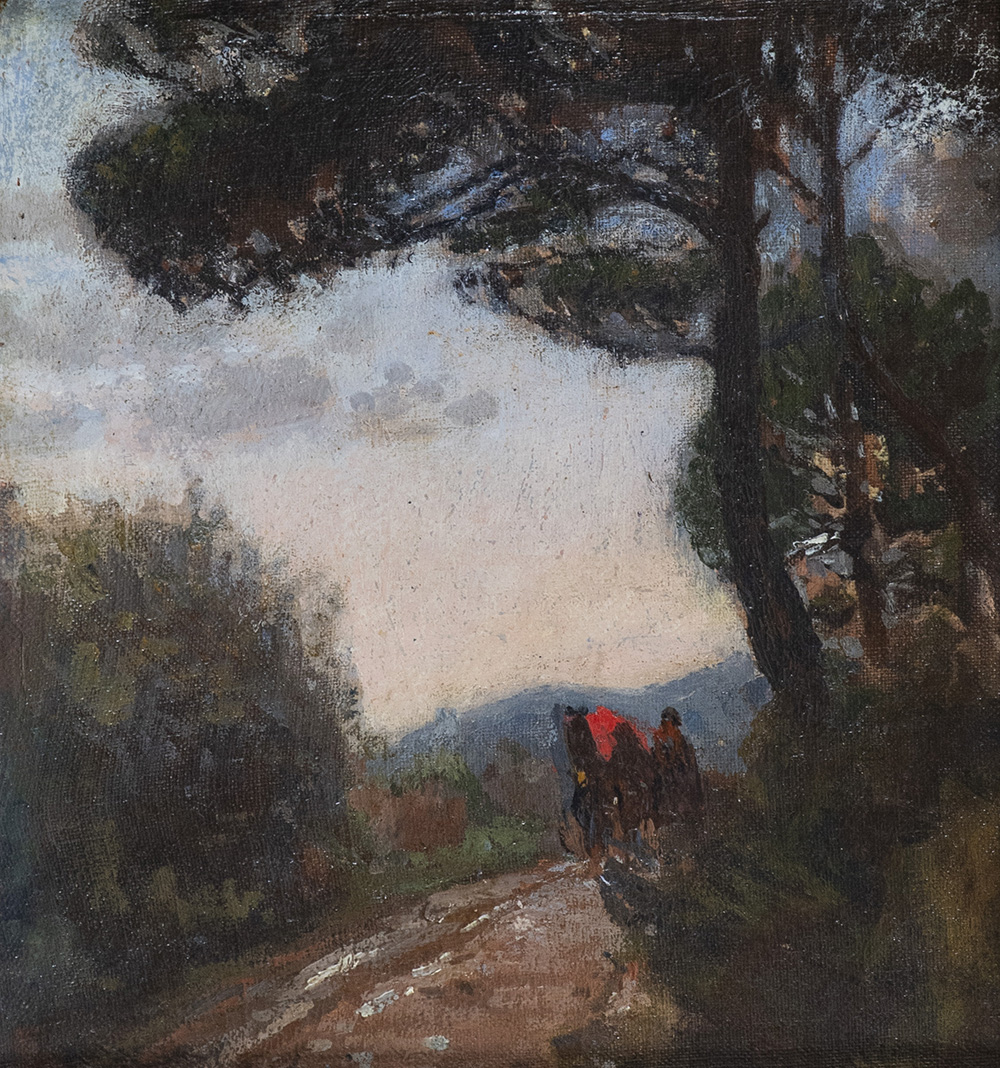 Raffaello Gambogi (Livorno 1874 Livorno 1943) Strada di campagna con calesse e contadini 1920 c.a Olio su cartone cm. 27x26,5., Firmato in basso a sinistra. Autentica di Giuliano Matteucci su foto. Certificato della "Galleria d'Arte Bacci di Capaci", Lucca, su foto.