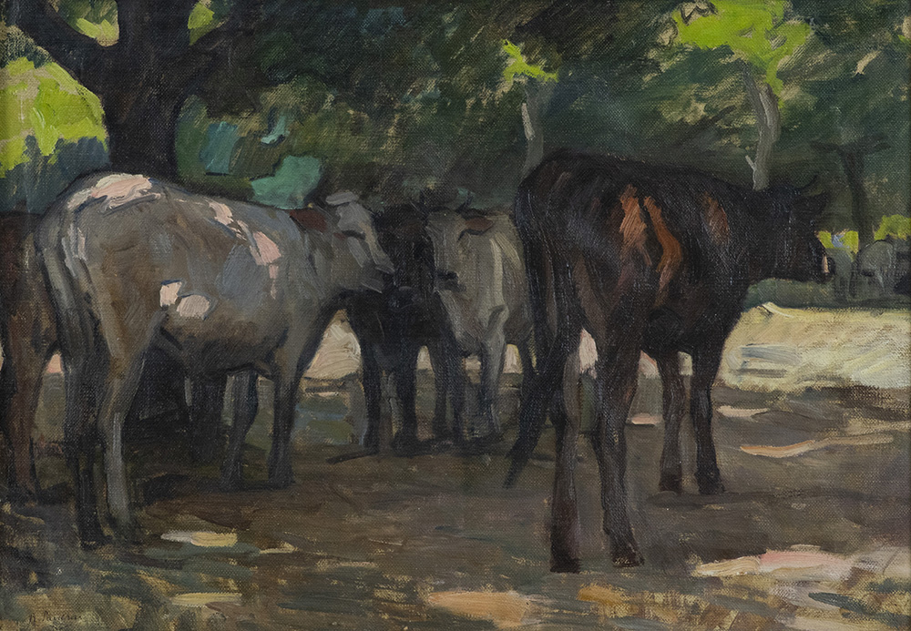 Ruggero Panerai (Firenze 1862 Parigi 1923) Buoi Olio su cartone, cm. 39x55., Firmato in basso a sinistra. Sul verso: "Etichetta Galleria Geri".