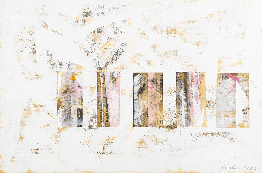 Toti Scialoja (Roma 1914 ) Senza titolo 1980 Collage e tecnica mista su cartoncino applicato su tavola, cm. 58x87., Firma e data in basso a destra. Autentica della Fondazione "Toti Scialoja", con Archivio n° 018007 e timbro a secco.