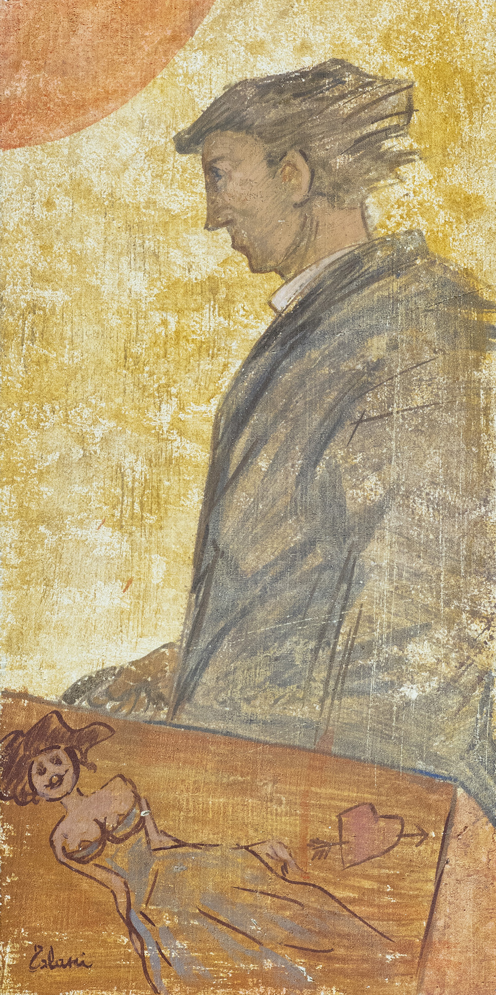 Giampaolo Talani (San Vincenzo 1955 Pisa 2017) Partenze - Studio per la stazione Santa Maria Novella di Firenze. Intonaco su tela applicata su intonaco, cm. 52,5x26,5., Firma e data in basso a sinistra. Autentica dell'Artista su foto, dove descrive lo studio per la realizzazione dell'affresco "Partenze" della stazione Santa Maria Novella di Firenze.