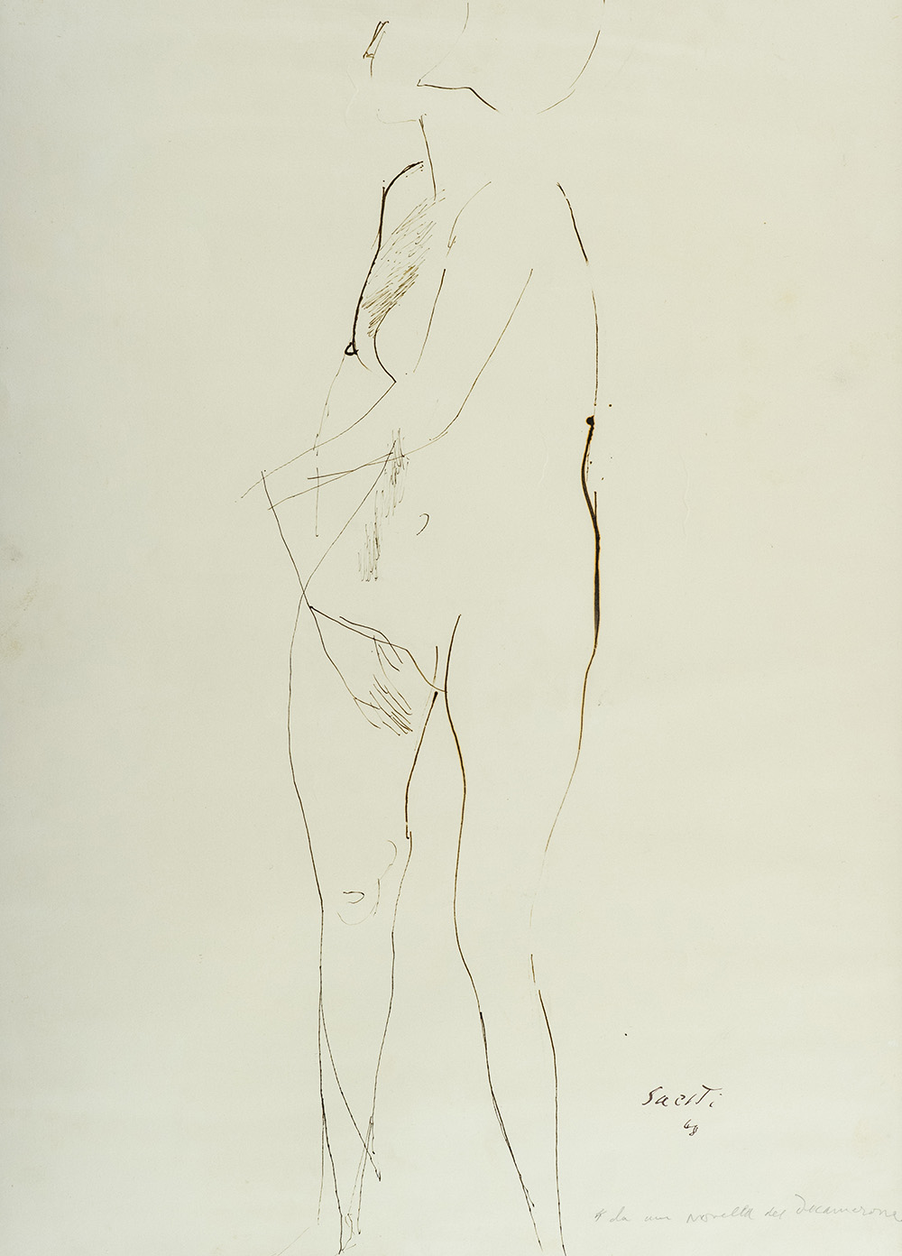 Bruno Saetti (Bologna 1902 1984) Da una novella del Decamerone 1968 China su cartoncino, cm. 70x50., Firma, data e titolo in basso a destra.