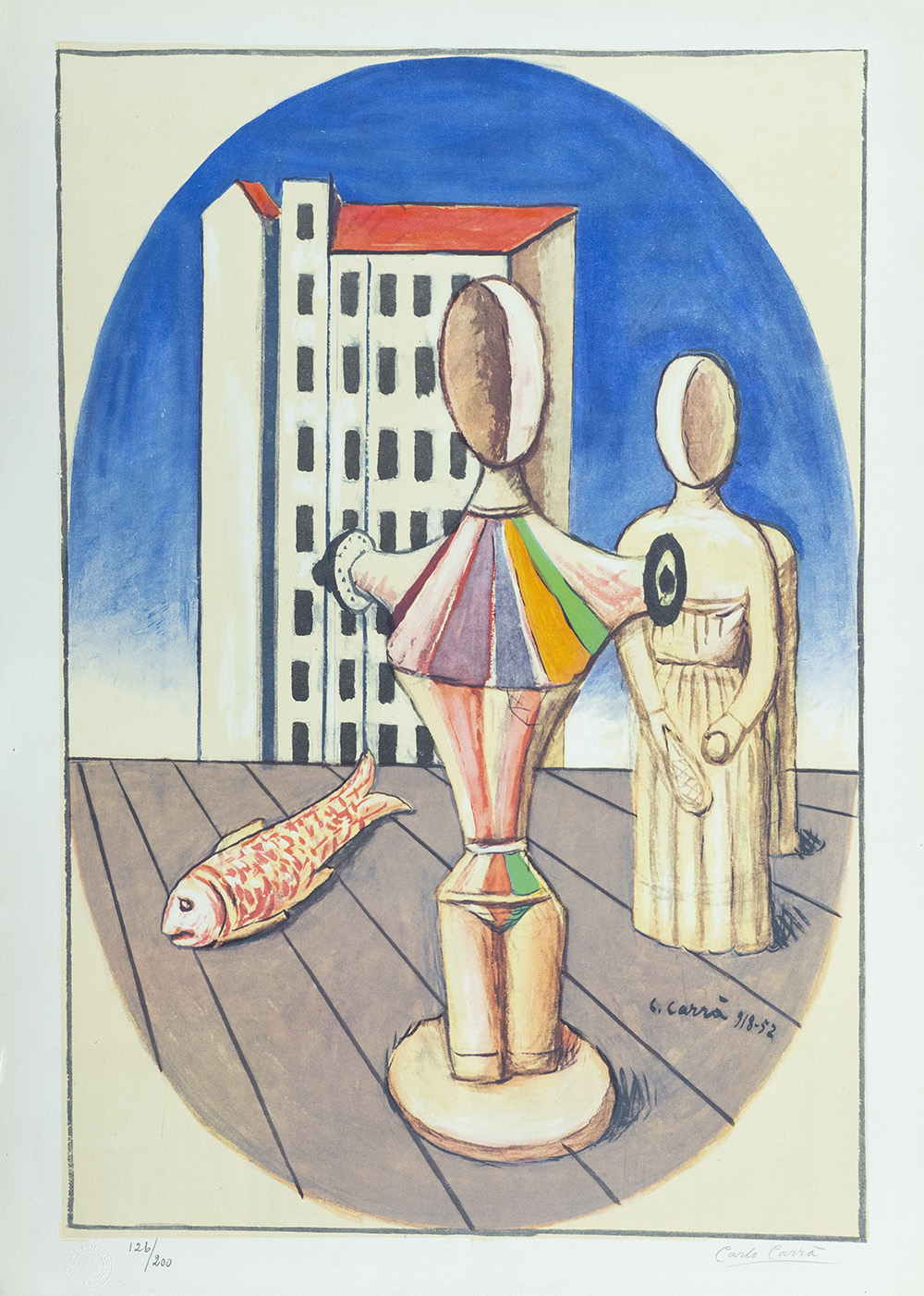 Carlo Carrà (Quargnento (Al) 1881 Milano 1966) Ovale delle apparizioni 1952 Fotolitografia a colori su carta, cm. 77x64,5, es. 126/200., Firma in basso a destra timbro a secco "Galleria d'Arte Cavallino", Venezia e tiratura in basso a sinistra. Sul verso: descrizione.