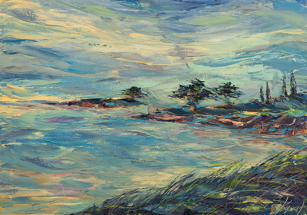 Olga Koval (Kirovogad, Ukraina 1980 ) Lago turchese 2017 Olio su tela, cm. 50x70., Firmato in basso a destra. Sul verso: firma, data e titolo.