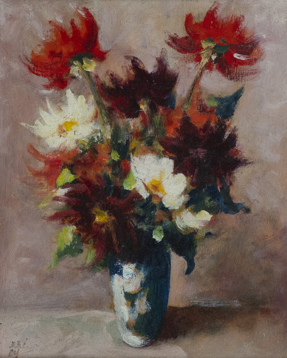 Corrado Michelozzi (Livorno 1883 1965) Dalie Olio su tavola, cm. 24,5x19,5., Siglato in basso a sinistra. Sul verso: firma e titolo.