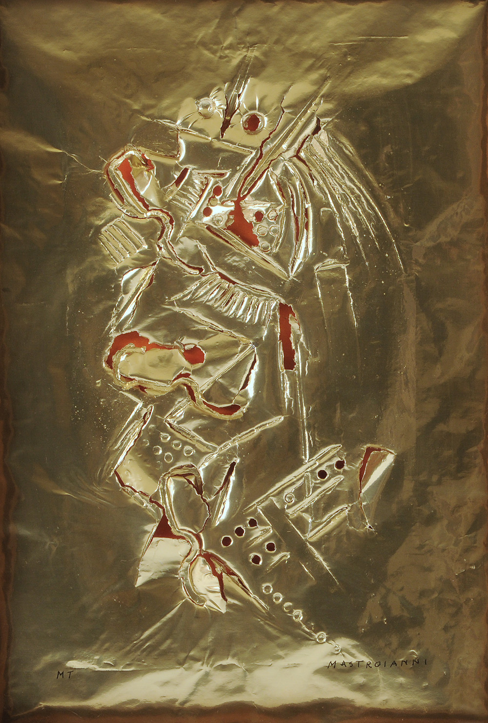 Umberto Mastroianni (Fontana Liri (Fr) 1910 Marino Laziale (Rm) 1998) Senza titolo Lacerazione e sbalzi di alluminio dorato, cm. 48x33, Firmato in basso a destra. Certificato di Autenticità "Galleria Arte Più", Ferrara.