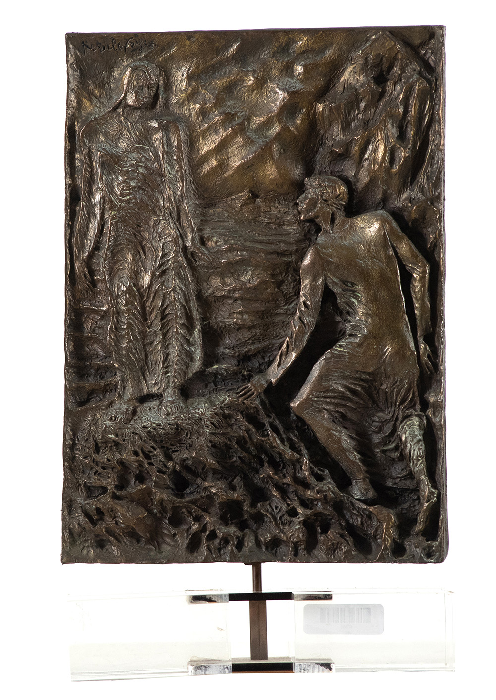 Pericle Fazzini (Grottammare (Ap) 1913 Roma 1987) Dante incontra Virgilio Bassorilievo in bronzo, cm. 33,4x24,5x3, es. multiplo., Firma in alto a sinistra, titolo sul lato.