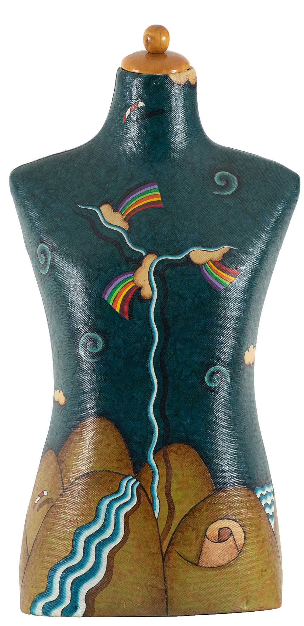 Giuliano Ghelli (Firenze 1944 2014) Giuzzante fantasia Olio e acrilico su tela e manichino, cm. 80x26x35., Firmato in basso a destra. Sotto la base: firma, titolo e n° M17.