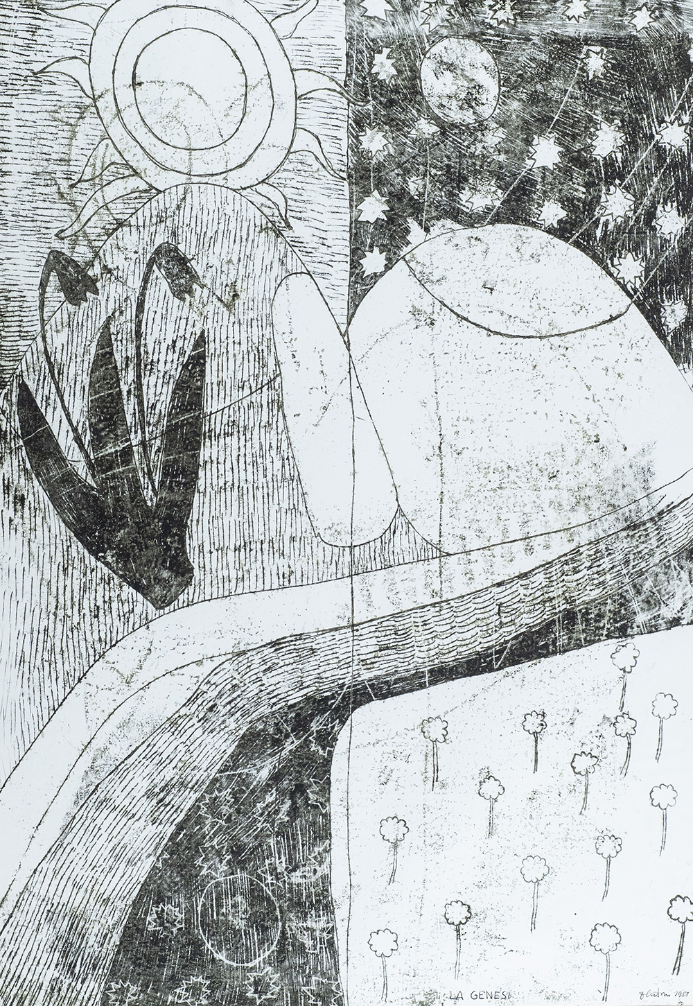 Venturino Venturi (Loro Ciuffenna (Ar) 1918 2002) La genesi 1988 Olio impresso su carta, cm. 100x70., Firma, data e titolo in basso a destra. Bibliografia: Lucia Fiaschi "Venturino Venturi, Catalogo Generale Volume I,Carlo Cambi editore, pag. 313 n. 311. Autentica della Dott.ssa Lucia Fiaschi su foto.