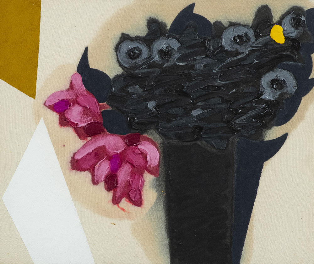 Concetto Pozzati (Vò di Padova 1935 Bologna 2017) A che punto siamo con i fiori 1987 Olio su tela, cm. 25x30x3., Sul verso: firma, data ed etichetta dell'Artista con descrizione.