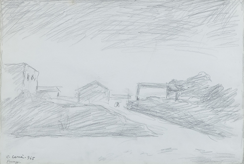 Carlo Carrà (Quargnento (Al) 1881 Milano 1966) Paesaggio 1965 Lapis su carta, cm. 33x48., Firma, data e titolo in basso a sinistra. Autentica di Massimo Carrà su foto.
