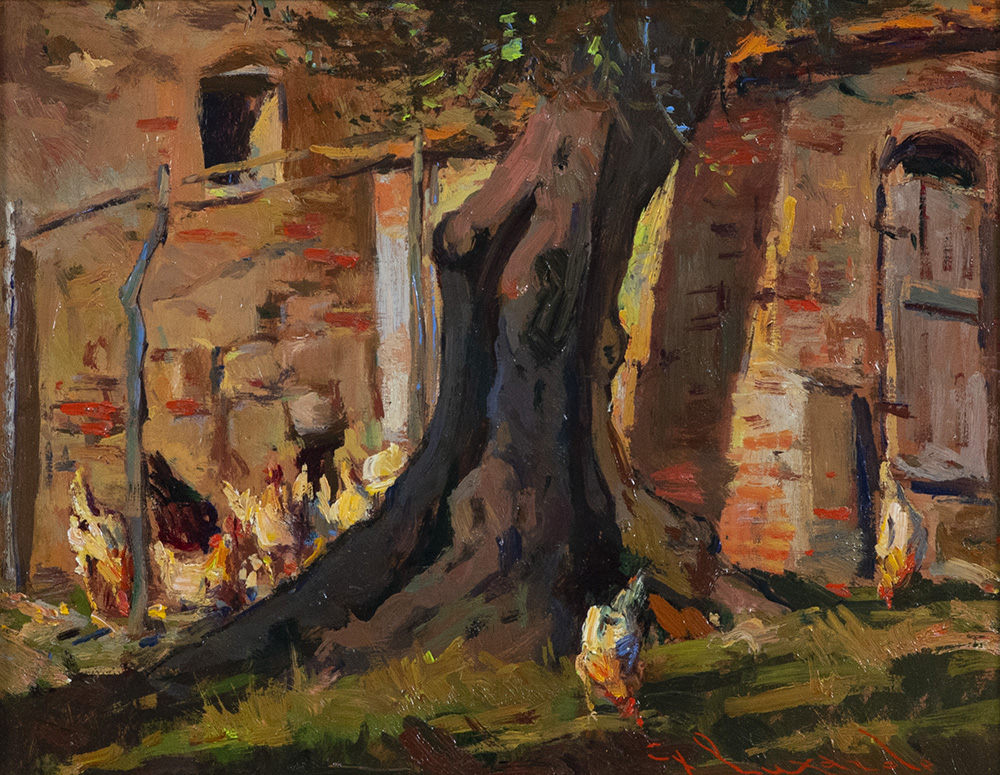 Giorgio Luxardo (Livorno 1937 ) Nell'aia 1972 Olio su tavola , cm. 26x33., Firmato in basso a destra. Sul verso: firma e data.