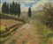 Giorgio Luxardo (Livorno 1937 ) Strada campestre Olio su tavola, cm. 23x27, Firmato in baso a destra; Sul verso: firma e titolo; Timbro: Galleria d'Arte La Tavolozza, Rosignano Solvay, Livorno.