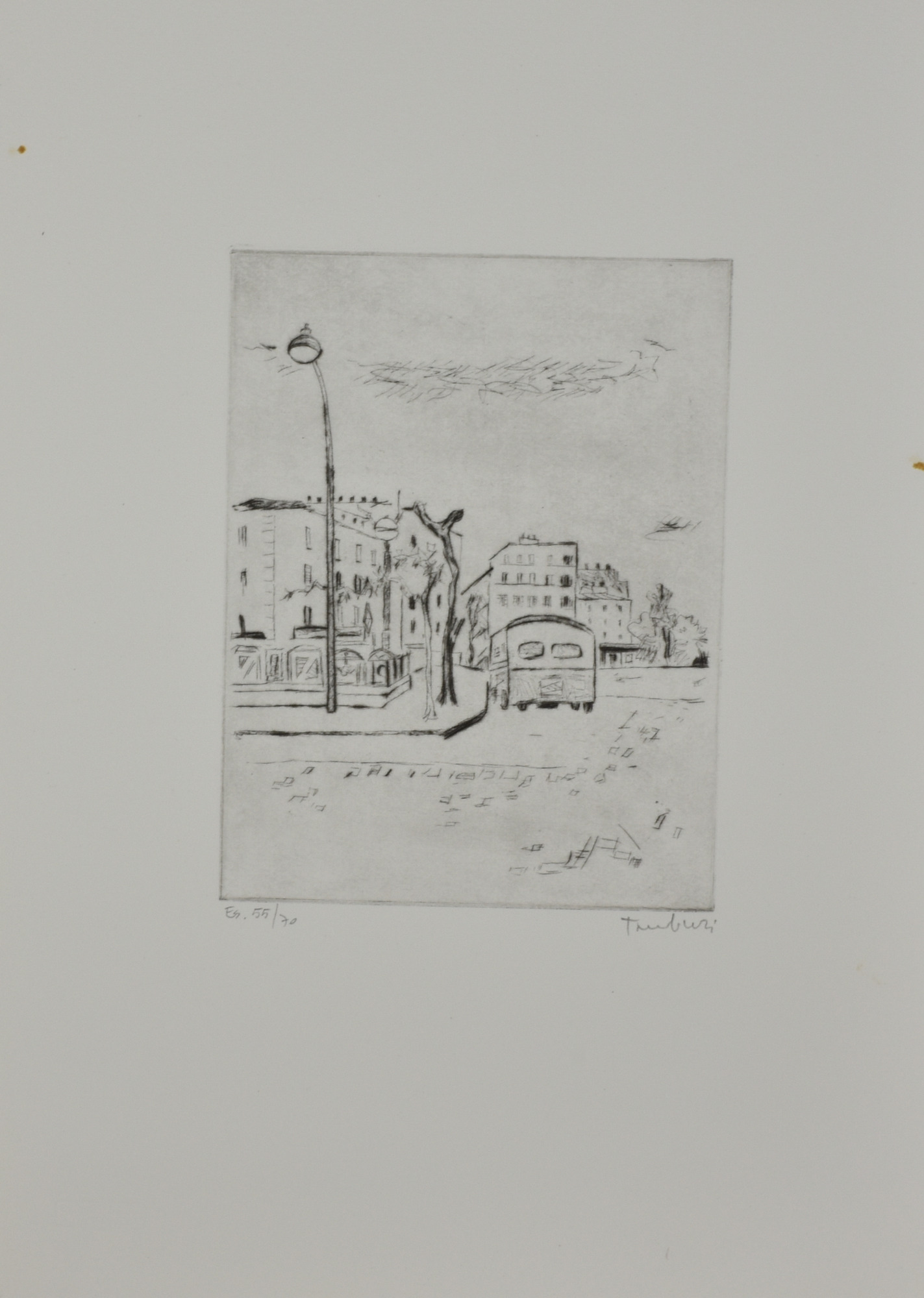 Orfeo Tamburi L'AUTOBUS acquaforte su carta, cm 49x36 (lastra cm 23,5x18) esemplare 55 di 70 sul fronte: firma e timbro a secco "Luigi De Tullio Stampatore"