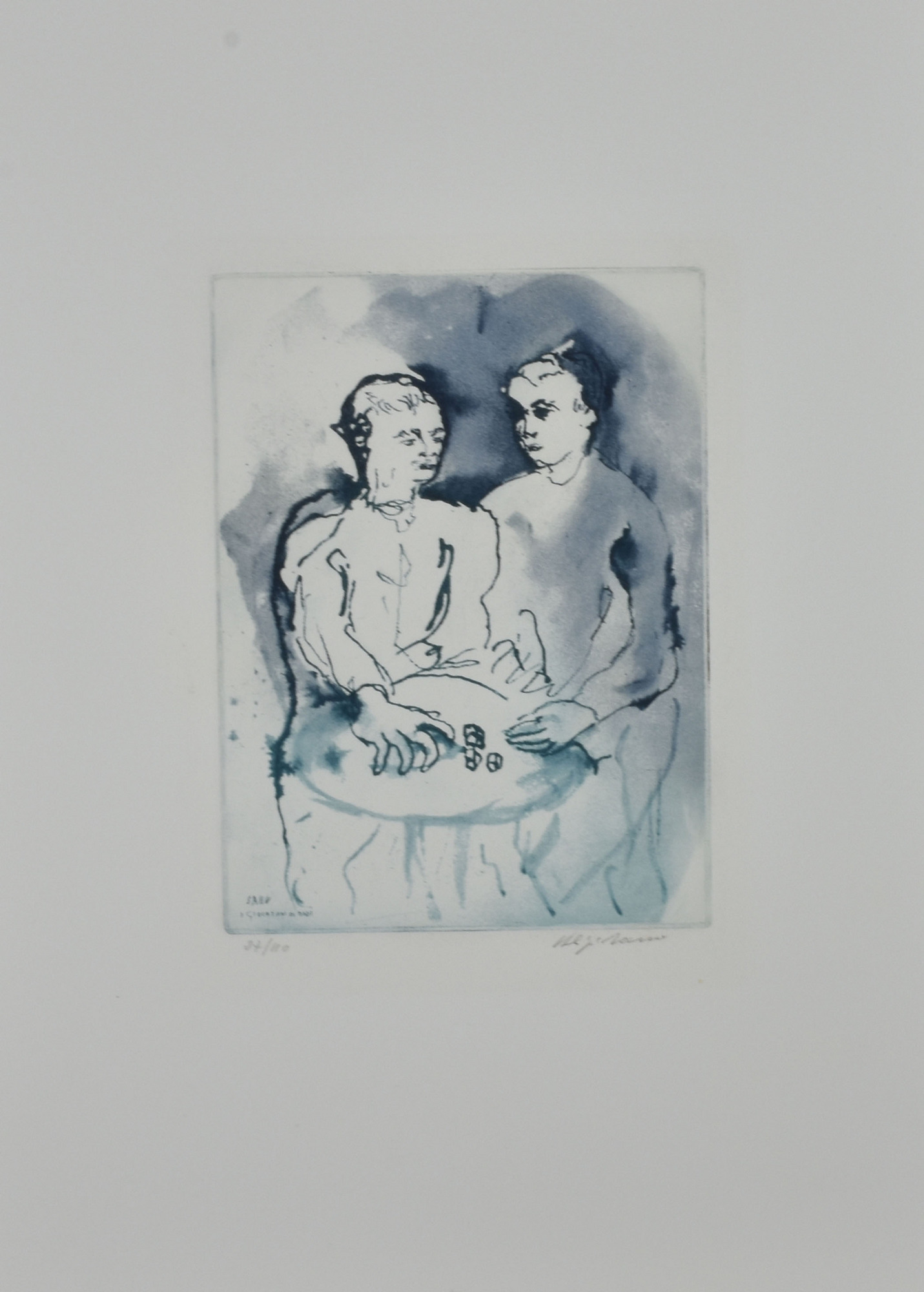 Aligi Sassu GIOCATORI DI DADI incisione su carta, cm 50x36 (lastra cm 22x16)...