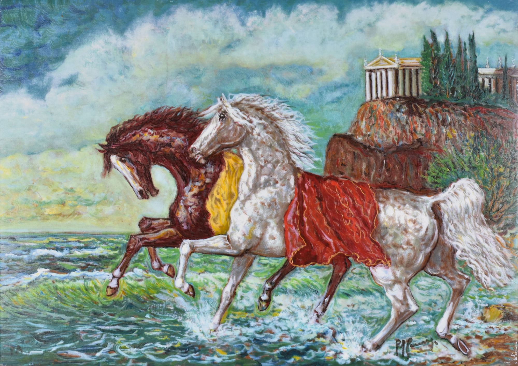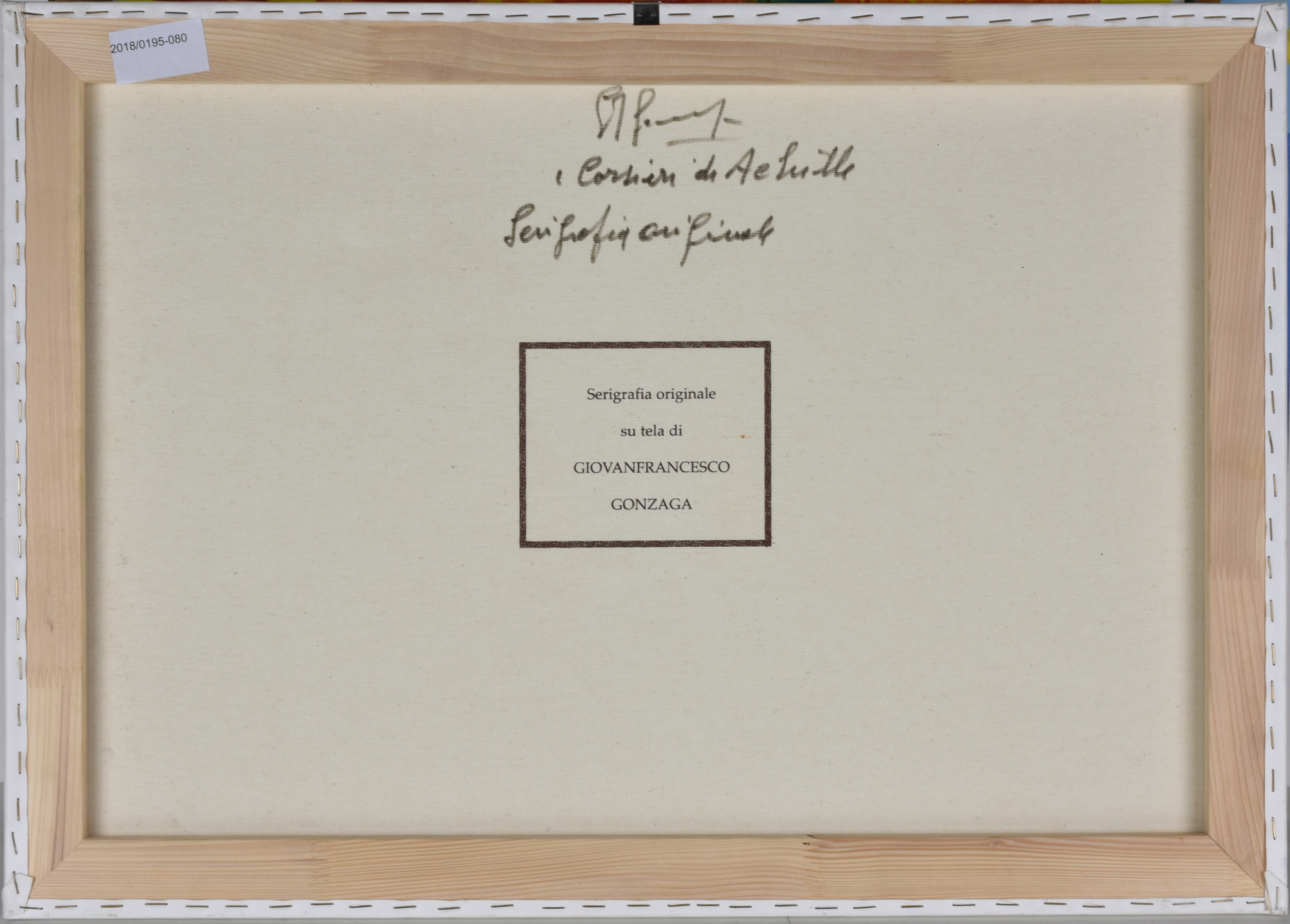 Giovan Francesco Gonzaga CORSIERI DI ACHILLE serigrafia su tela, cm 50x70 sul fronte: firma sul retro: firma e titolo