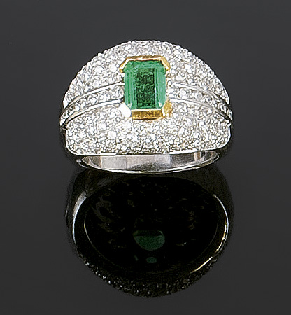 ROCCA Anello in oro bianco, a fascia, firmato "Rocca" con smeraldo centrale di taglio rettangolare e pavé di diamanti taglio brillante rotondo per complessivi ct 1,50 ca Peso gr. 16,8 Misura 15
